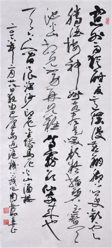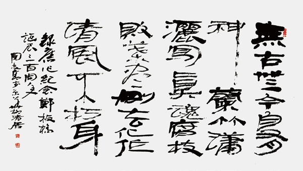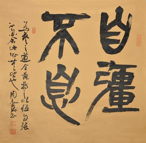 周志高认为,当代书法需要创新,但他更旗帜鲜明地疾呼必须坚守底线,他反对“任笔为体,聚墨成形”的所 谓创新作品。他始终有一条书法作品的一个底线标准,那就是不论一幅作品具有多么强的时代感或现代感,它必须 具有汉字可读性和书写性。正是这样,他的书法作品也赋有了包容性和个性。