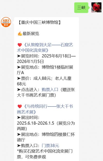 温馨提示:微信搜索公众号【重庆本地宝】,关注后发送【三峡】获博物馆最新展览及购票入口,免费门票预约入口,开放时间,游玩攻略,展馆介绍,近期展览,周边景点推荐等。