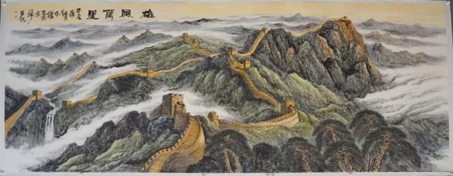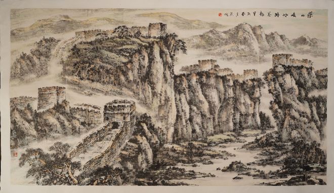 著名女画家张馨月的《长城朝晖》是一幅金色长城,长城沐浴在清晨的阳光之中,蓬勃壮美,瑰丽雄伟;大红袍画家韩伟华的作品《长城》骨坚劲强、浑厚华滋;著名画家姜广恒的《崇山峻岭卧苍龙》质朴有力、气势如虹。